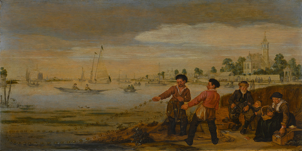 Vissers aan de Amstel te Amsterdam in de nabijheid van 'De Pauwentuin', het buitenhuis van der familie Pauw. Twee mannen halen een net binnen. Het eerste plan met de vissers en echtpaar met kind rechts is volledig uitgeschilderd; de rest is voor het grootste deel in grisaille geschilderd; de bomen zijn in groen uitgevoerd.