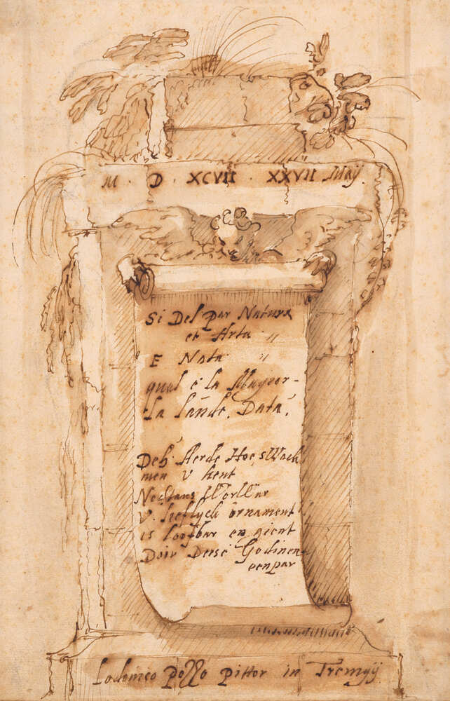 opschrift opschriften op de steen: M. D. XCVII.XXVII Maij. / Si Del Par Natura / et Arta / E Nata / qual è la Magior - / la laude. Data! / Deh! Aerde Hoe swack / men V kent / Nochtans worwar / V´lieflyck ornament / is loofbar en gient / Doir Deese Godinen / eenpar / Lodouico Pozzo Pittor in Treuigij.