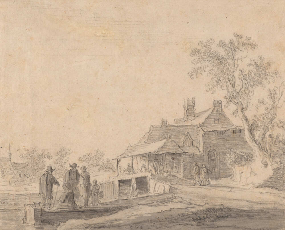 Anonieme veiling, Frankfurt a. M. (F.A.C. Prestel) 22-26 november 1927, nr. nr. 130: 'Ländliches Wirtshaus am Kanal, im Vordergrunde eine Gruppe von zwei Männern und zwei Frauen mit einem Kinde, die auf die Fähre warten.' Afb. 9 (DM 380,-); Veiling C. Brosse e.a., Berlijn (Hollstein & Puppel) 8-10 november 1928, nr. 520: 'Landschaft mit Bauernhäusern hinter einer überdeckten Holzbrücke, vorn auf einem Landungsteg eine wartende Bauernfamilie mit kind.' (DM 400,-). Kunsthandel R. W. P. de Vries, Amsterdam, Magazijncatalogus 1929, p. 108 met afb. (Fl. 500,-). Aankoop 1939 van Kunsthandel Schidlof, Parijs (Fr. 2500,- tes.m. cat. nr. 48, cat. nr. 77 en TA 18074, onbekend), volgens documentatiearchief, vermeld in het jaarverslag over dat jaar, p. 18