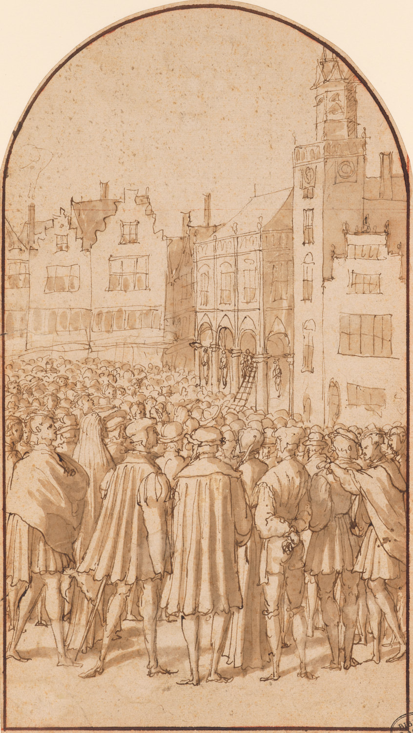 In de jaren 1530 zorgde een groep revolutionaire wederdopers voor grote onrust in Amsterdam. Als zulke ketters gepakt werden kregen ze de doodstraf. Op deze twee tekeningen worden wederdopers terechtgesteld op de Dam. De menigte is massaal toegestroomd om te zien hoe de opstandelingen worden opgehangen. Er bungelt ook een vrouw aan de galg voor het stadhuis. Een schrale troost voor de wederdopers: er werd wel op religie, maar niet op sekse gediscrimineerd. ( Anneke van de Kieft)