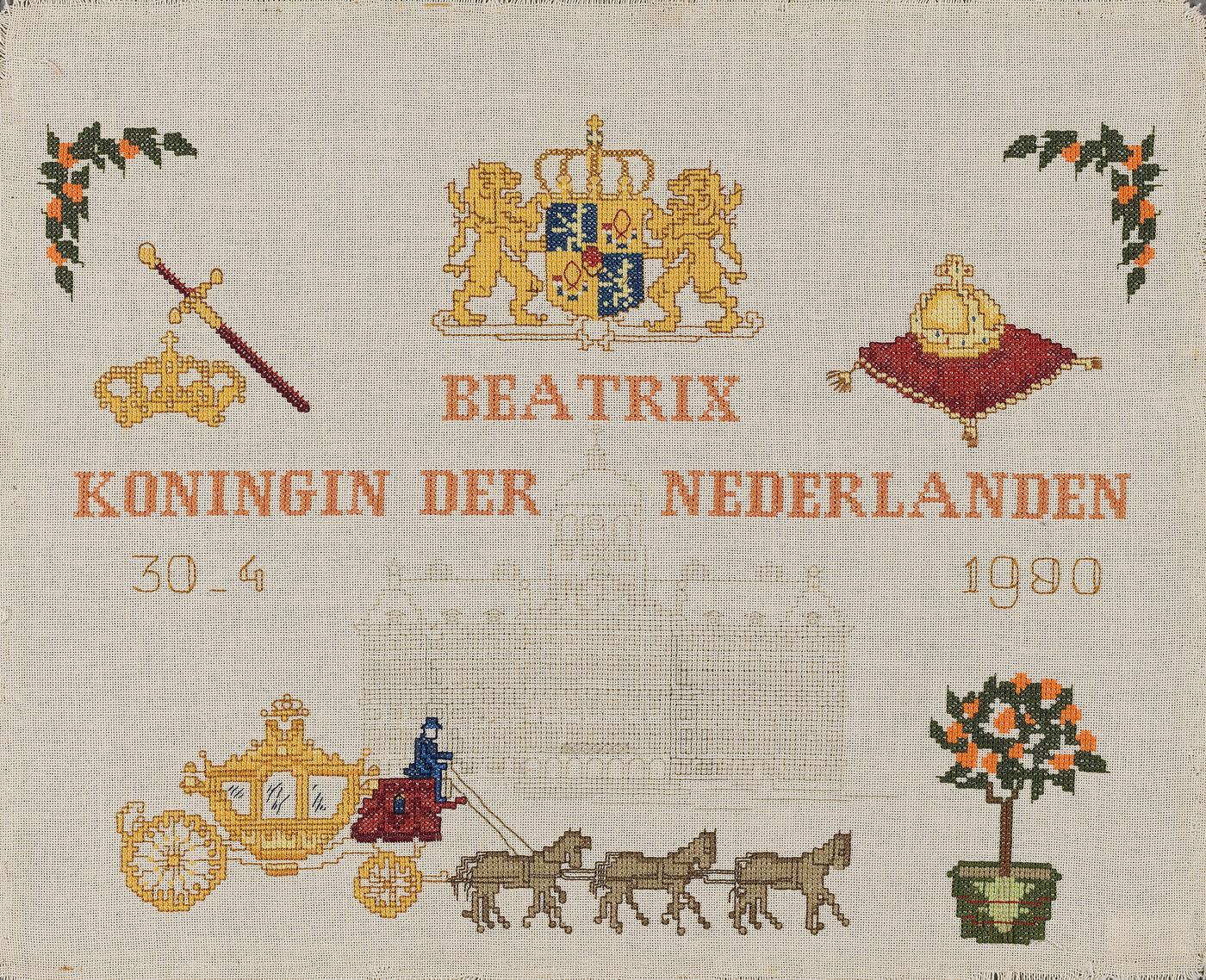 - daaronder, in midden van doek, de tekst BEATRIX/ KONINGIN DER NEDERLANDEN/ 30-4 1980/;
