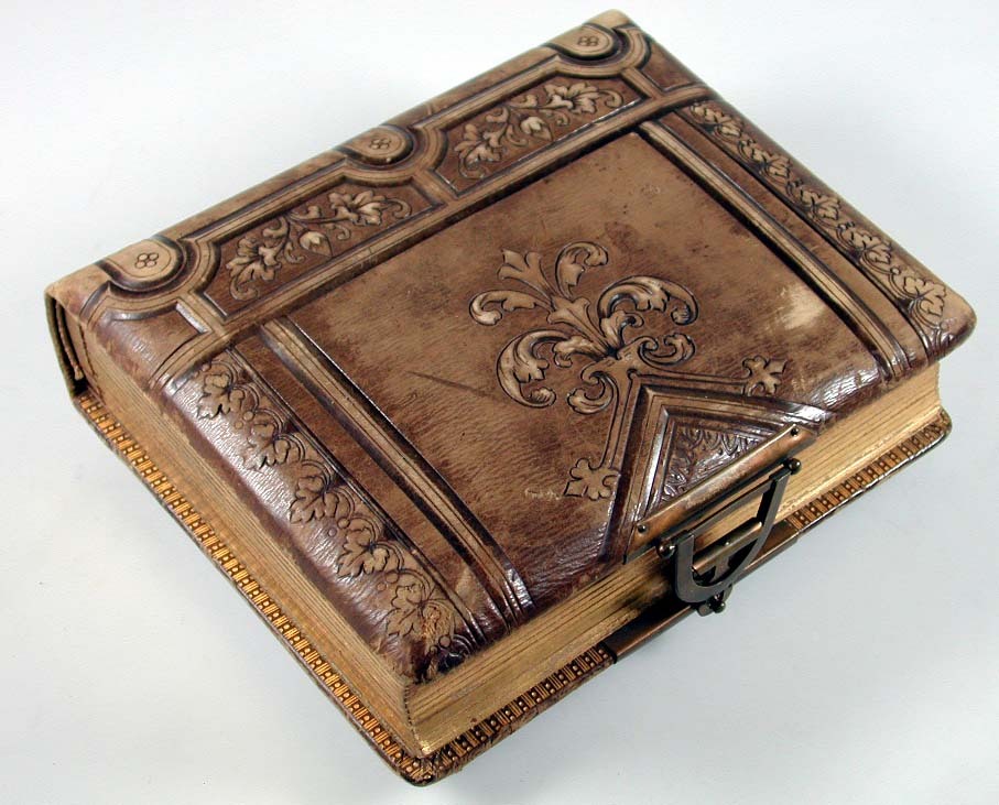 Leren band met koperen sluiting, 32 pagina's.- Trefwoorden