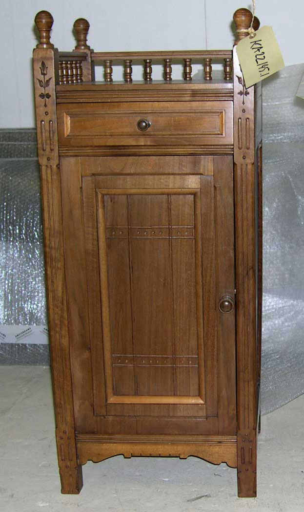 Nachtkastje in massief noten, voorzien van lade bovenin en (linksdraaiend) deurtje eronder met daarachter twee legplanken. Rustend op geprofileerde stijlen, bekroond met bolvormen, onderling verbonden door regels en rond bovenblad aan drie zijden een lage balustrade. Zijwanden en deurpaneel gevuld met kraalschroten. Dunne glansvernis of wasafwerking.