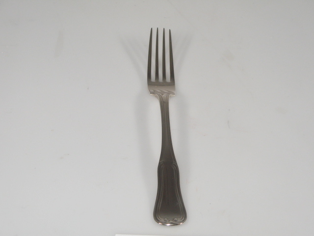 Tafelvork met gebogen spadelsteel en ronde steelkop. Voorzijde spadel met opstaande filetranden, beginnend en eindigend in oogjes. Voorzijde voorts met dubbele inwaartse filet zonder knopje, de achterzijde met een enkel inwaartse filet met bijpassend lof.