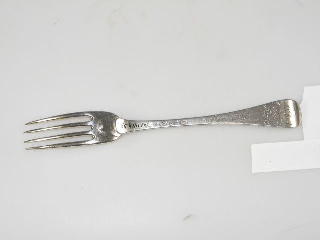 Tafelvork. Steel met middenribbe en omhoog gebogen ronde kop, aan de achterzijde dubbel Amsterdams lof. Op onderzijde steel is een monogram gegraveerd met initialen: D.I.A./ O.V.H./, de afkorting van Diaconie Oude Vrouwenhuis, alsmede een naam van diaken of diaconesse en het jaar van aantreden in die functie.