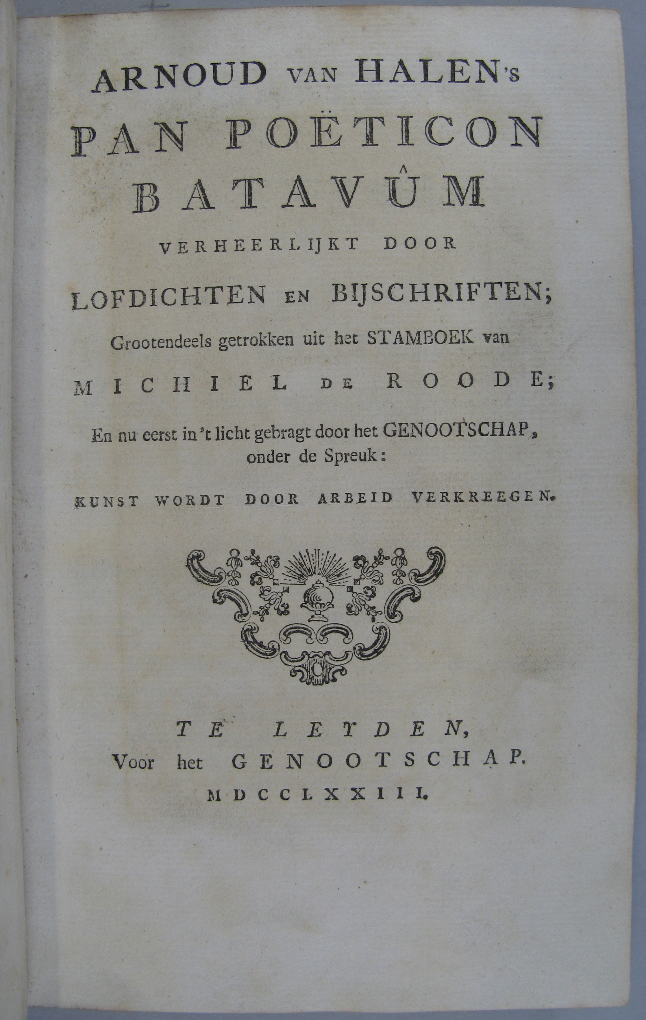 Arnoud van Halen's Pan Poëticon Batavûm verheerlykt door lofdichten [...] getrokken uit het stamboek van Michiel de Roode; En nu eerst in 't licht gebrgt door het geootschap [...] Kunst wordt door arbeid verkreegen. - Leiden : voor het genootschap., 1773., 1773