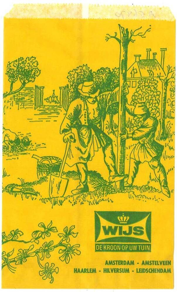 Geel zakje met aan voorzijde in groene inkt een reproductie van prent 'De hovenaar' van Luyken en logo van Fa. Wijs- Trefwoorden