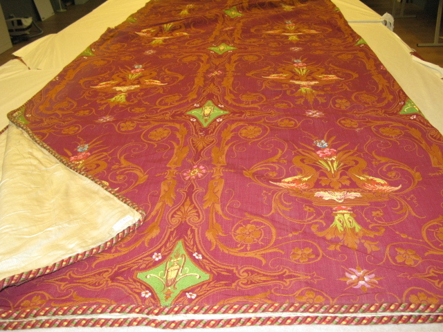 Overgordijn, negen dubbele plooien met drie houten ringen en vijf kleinere koperen ringen, waarvan twee ringen met metaaldraad zijn vastgezet. Koord in de kleuren bordeaux rood, groen, geel, lichtbruin en rood langs de voor- en onderranden, met de hand aangezet. Motieven: schaal mef vissen en bloemen, guirlandes met groene geometrische vlakken, met amfora in geel. Ondergrond bordeauxrood.