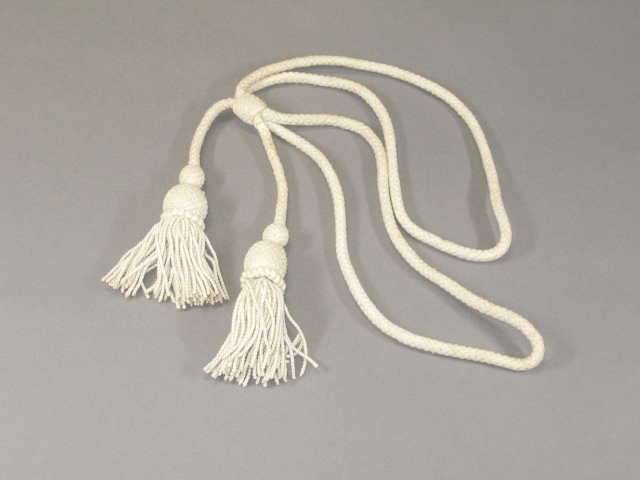 Wit katoenen gordijnkoord met twee verschillend geknoopte kwasten, halverwege het koord een gevlochten ring.- Keywords