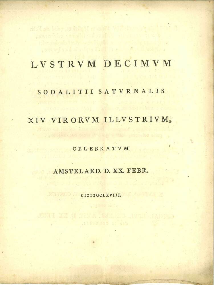 - Lustrum Decimum Sodalitii Saturnalis XIV Virorum Illustrium, Celebratum Amstelaed. D. XX. Febr. MDCCLXVIII, 1768