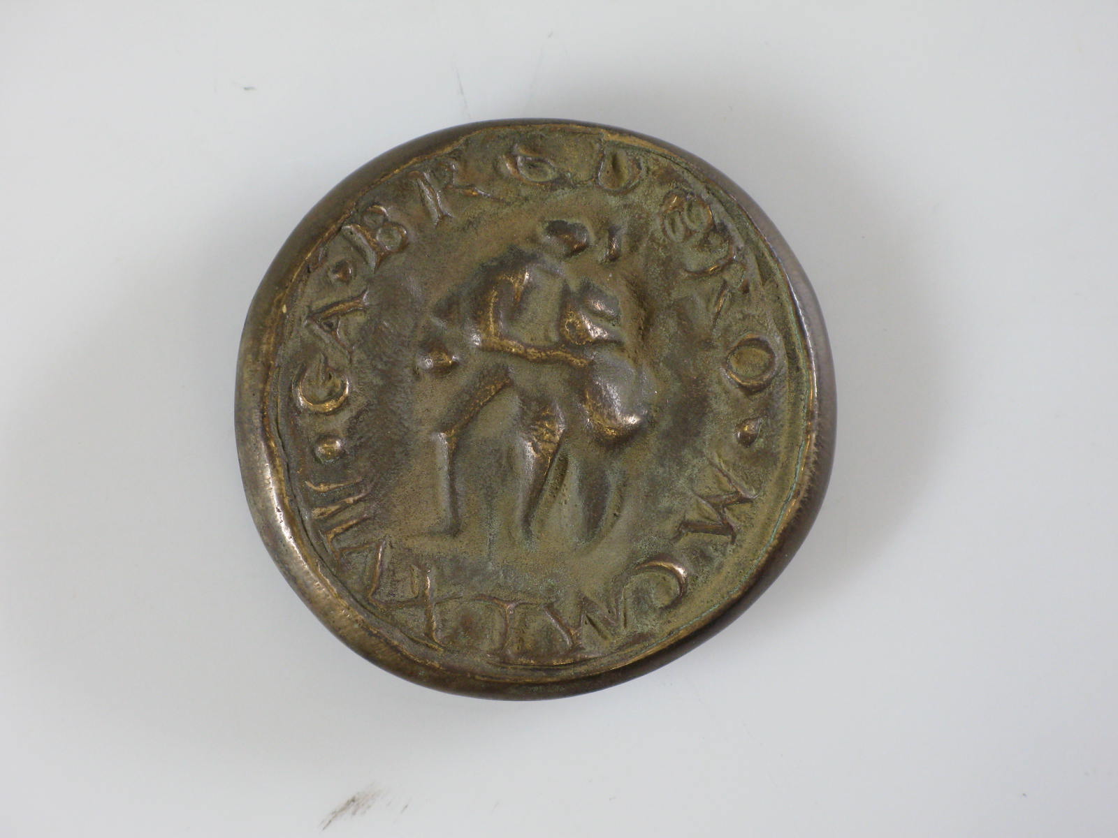 keerzijde: verbeelding van een scene uit de Spaanschen Brabander: hoofdrolspeler Jeronimo, links, een oplichter uit de Zuidelijke Nederlanden, in gesprek met een vrouw van lichte zeden, die hij probeert te kussen. Omschrift.