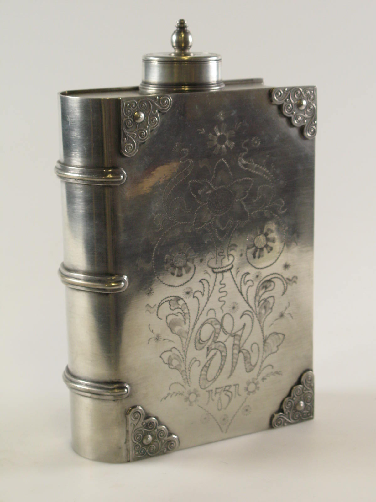 Drankfles in de vorm van een boek (1), in bruine doos (2).- Keywords