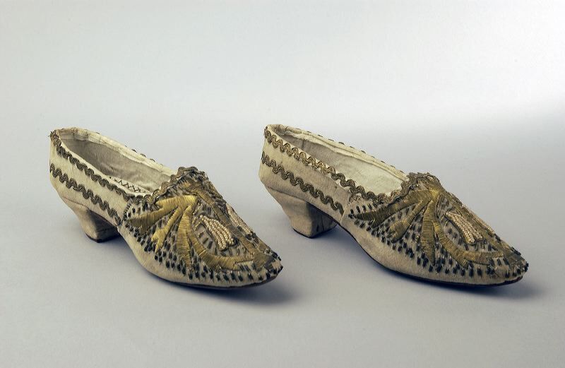 Wit fluweel met goud en kraaltjes geborduurd, met hakje.- Trefwoorden