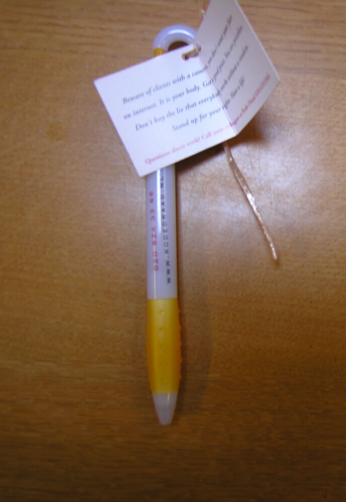 Geel-witte balpen, bedrukt met naam en telefoonnummer van De Rode Draad. Label aan touwtje. Tekst op label: Beware of clients with a camera, you don't want your face/ on internet. It is your body. Get a good price. You are priceless./ Don't buy the lie that everybody works without a condom./ Stand up for your rights. Have a life!/ / Questions about work? Call your colleagues at Rode Draad 020-6243366/.