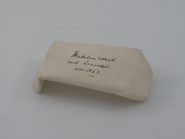 - opschrift voorop: Zilveren gedenkteeken, gedragen op oranje rozen in 1865, Ter herinne- ring aan de slag v. Waterloo, 1815.