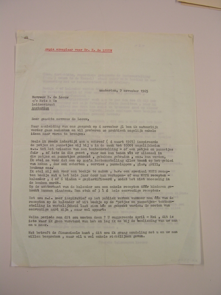 Brief van Toussie Salomonson-Keezer aan Mevr. H. de Leeuw (Metz & co). Twee pagina's (kopie)- Trefwoorden