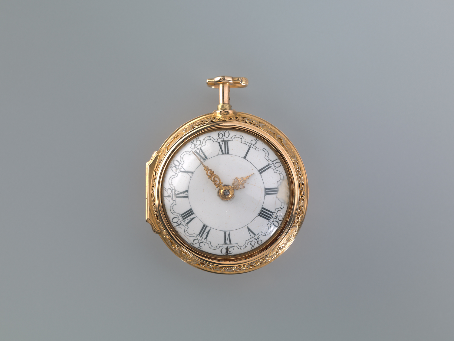Horloge met losse, scharnierende binnen- en buitenkast. Buitenkast met een gedreven voorstelling van de Overvloed op wolk gezeten, rechts een krijger met ram, links een vrouw met bijenkorf, achter haar een zittende vrouw met het Grootboek tussen handelswaar, op de achtergrond een figuur met weegschaal en op de voorgrond een Mercuriusstaf en olijftak, een allegorie op handel en nijverheid verbeeldend. Voorstelling op een geruwde ondergrond, binnen geaccoleerde symmetrische omranding van C-voluten. Zijkant bak opengewerkt met symmetrische bladvoluten en vier door C-voluten gevormde schilden met alternerend twee mannen- en twee vrouwenkoppen. Achterzijde gegraveerd met ster en met opwindas. Op tegenrand vier velden met een dolfijn, een vogel, een draak en een eekhoorn op geruwde ondergrond, respectievelijk de Vier Elementen Water, Lucht, Vuur en Aarde symboliserend. Bak van binnenkast deels opengewerkt en gegraveerd met blad- en bloemranken, vogels en cartouche met monstermasker. Glasrand met halfbol horlogeglas. Bodem binnenkast gegraveerd met ster. Bovenzijde met pendant met beugel. Horloge met spillegang, Engelse kloof, repetitieslagwerk en snekketting. Geëmailleerde Hollandse wijzerplaat met vergulde wijzers. Uurwerk gesigneerd P. Bramer.