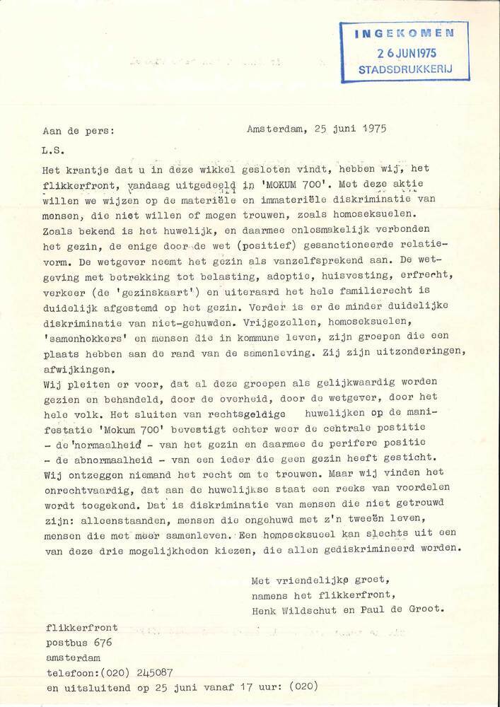 - Persbericht voor actie Flikkerlicht op manifestatie 'Mokum 700' in de RAI op 25 juni 1975, 1975