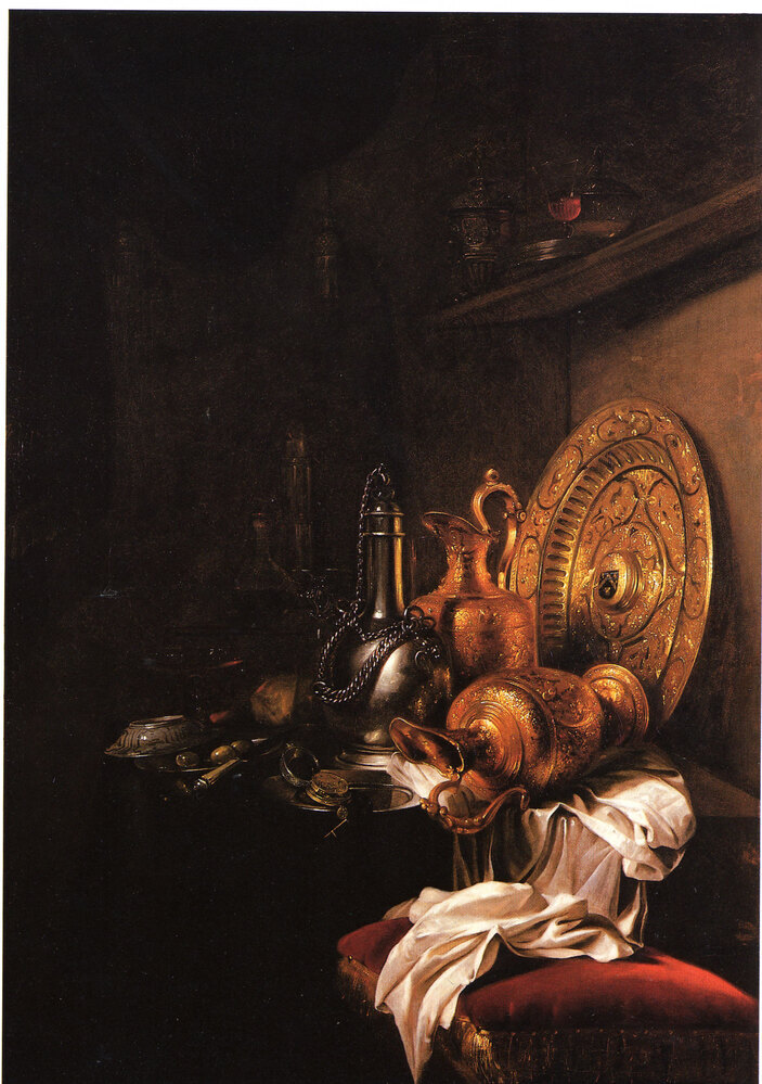 Een pronkstilleven is een verzameling kostbare voorwerpen en etenswaren, waarmee de schilder zijn vaardigheden kon laten zien. Dit pronkstilleven is vervaardigd door de Nederlandse kunstschilder Willem Kalf, die beschouwd wordt als een van de belangrijkste schilders van stillevens uit de zeventiende eeuw. Zijn zeer gedetailleerde werken kennen vaak grijsbruine tinten. Zo ook dit pronkstilleven, waarop een tafel met kostbaar zilverwerk centraal staat. Een grote schaal van verguld zilver leunt tegen de muur, daarvoor bevinden zich twee schenkkannen van hetzelfde materiaal en een zilverkleurige kan met metalen koord. Op tafel liggen verder nog twee zilverkleurige borden, een mes met waarschijnlijk benen handvat, een beschilderde aardewerken kom en een zakformaat uurwerk of snuifdoos. In de achtergrond is nog meer glas- en zilverwerk zichtbaar. ( Sarah Remmerts de Vries)