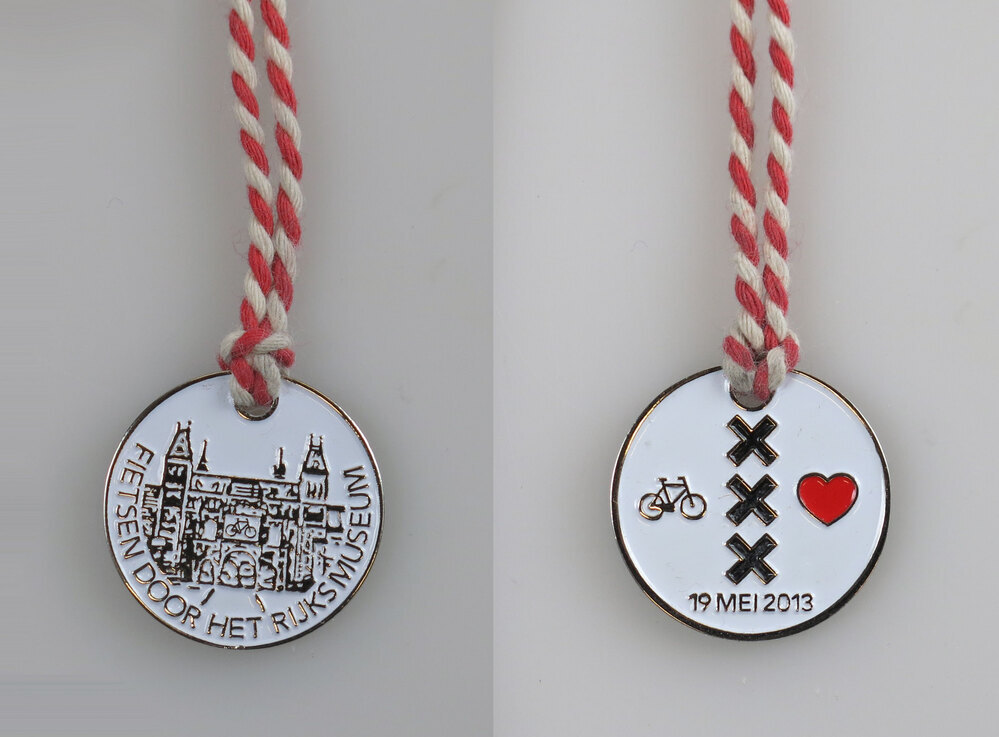 Deze metalen herinneringsmedaille is vervaardigd ter gelegenheid van het fietsen onder het Rijksmuseum, op 19 mei 2013. De fietstunnel was vanaf december 2003 gesloten geweest, vanwege de renovatie van het Rijksmuseum. Tijdens de renovatie werd door Stadsdeel Zuid besloten dat de tunnel ook na de heropening gesloten zou blijven voor fietsers. Hier kwam echter zoveel protest tegen, dat de Amsterdamse gemeenteraad besloot de tunnel toch open te houden. Op 13 mei 2013 werd de tunnel weer voor fietsverkeer geopend. Het vernieuwde Rijksmuseum werd een maand later officieel heropend door koningin Beatrix. ( Sarah Remmerts de Vries)