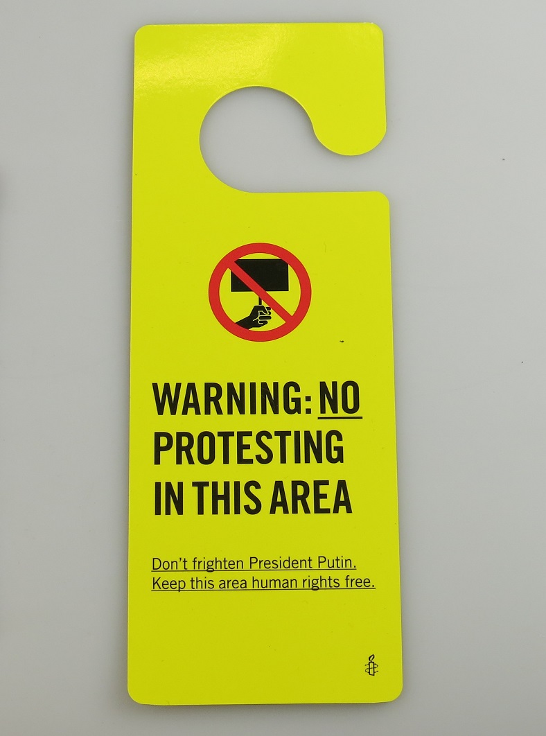 Op 8 april 2013 bracht de Russische president Vladimir Poetin een bezoek aan Amsterdam. Rusland was op dat moment vaak in het nieuws vanwege het werken aan een anti-homowet en de vervolging van van dissidente advocaten, kritische journalisten en de punkband Pussy Riot. Tijdens het bezoek aan Amsterdam waren er daarom vanuit verschillende hoeken protestgeluiden te horen. Amnesty International liet speciaal voor het bezoek deze felgele deurhanger vervaardigen tegen deze schendingen van mensenrechten. De deurhanger draagt de tekst: WARNING: NO PROTESTING IN THIS AREA / Don't frighten President Putin. Keep this area human rights free.' ( Sarah Remmerts de Vries)