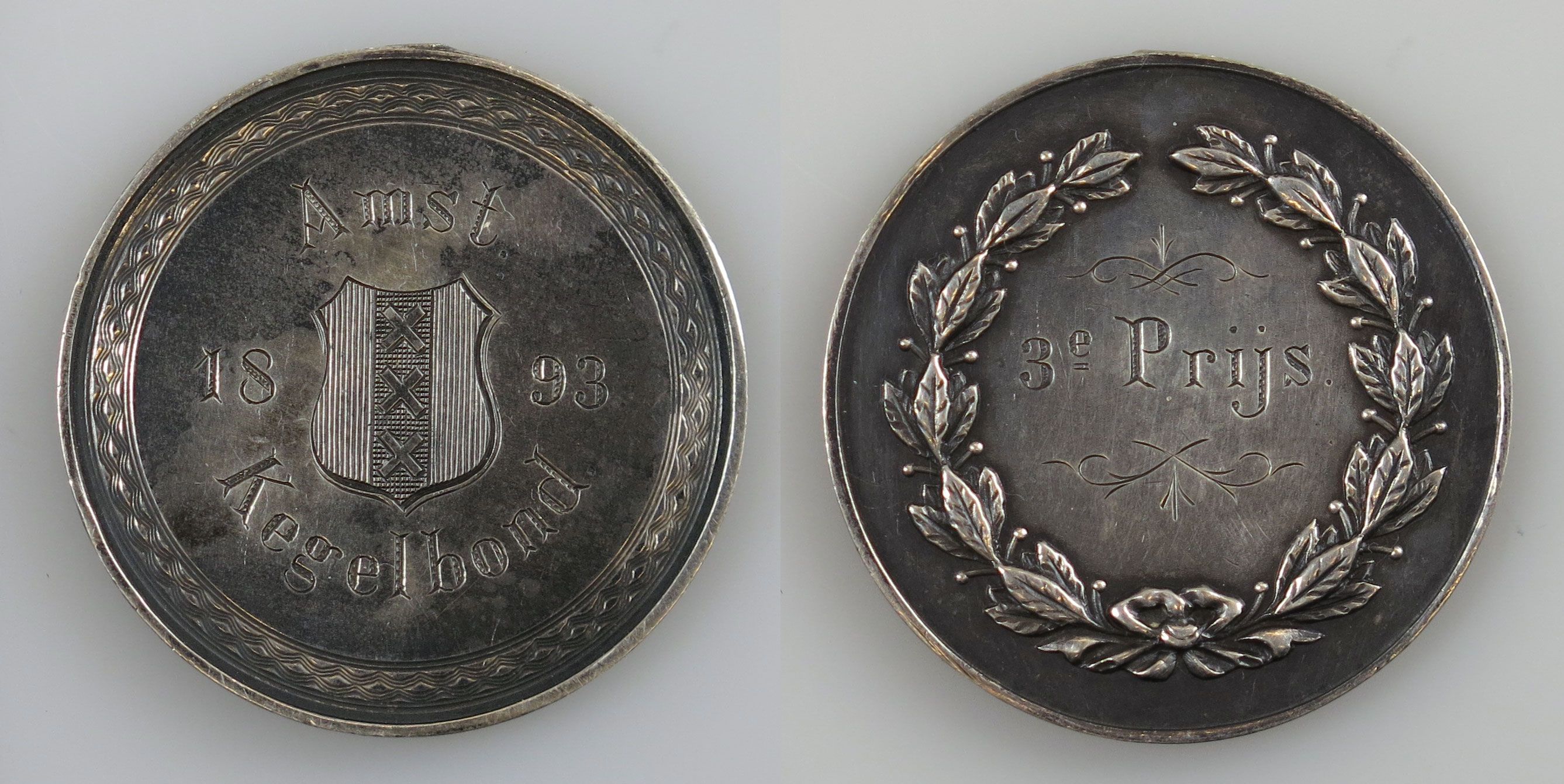 Deze zilveren penning is in 1893 vervaardigd als derde prijs van de Amsterdamsche Kegelbond. Kegelen is een sport waarbij men negen kegels aan het eind van een lange baan met een bal probeert om te gooien. Hoewel de sport al redelijk oud is, werd het pas in de negentiende eeuw echt populair. De Amsterdamsche Kegelbond is in 1889 opgericht, een jaar later kwam daar ook de Algemene Nederlandse Kegelbond bij. De voorzijde van de penning toont de tekst ‘Amst. Kegelbond / 1893’ met in het midden het Amsterdamse wapen met de drie Andreaskruizen. Op de keerzijde is in een lauwerkrans ‘3e Prijs’ geschreven. ( Sarah Remmerts de Vries)