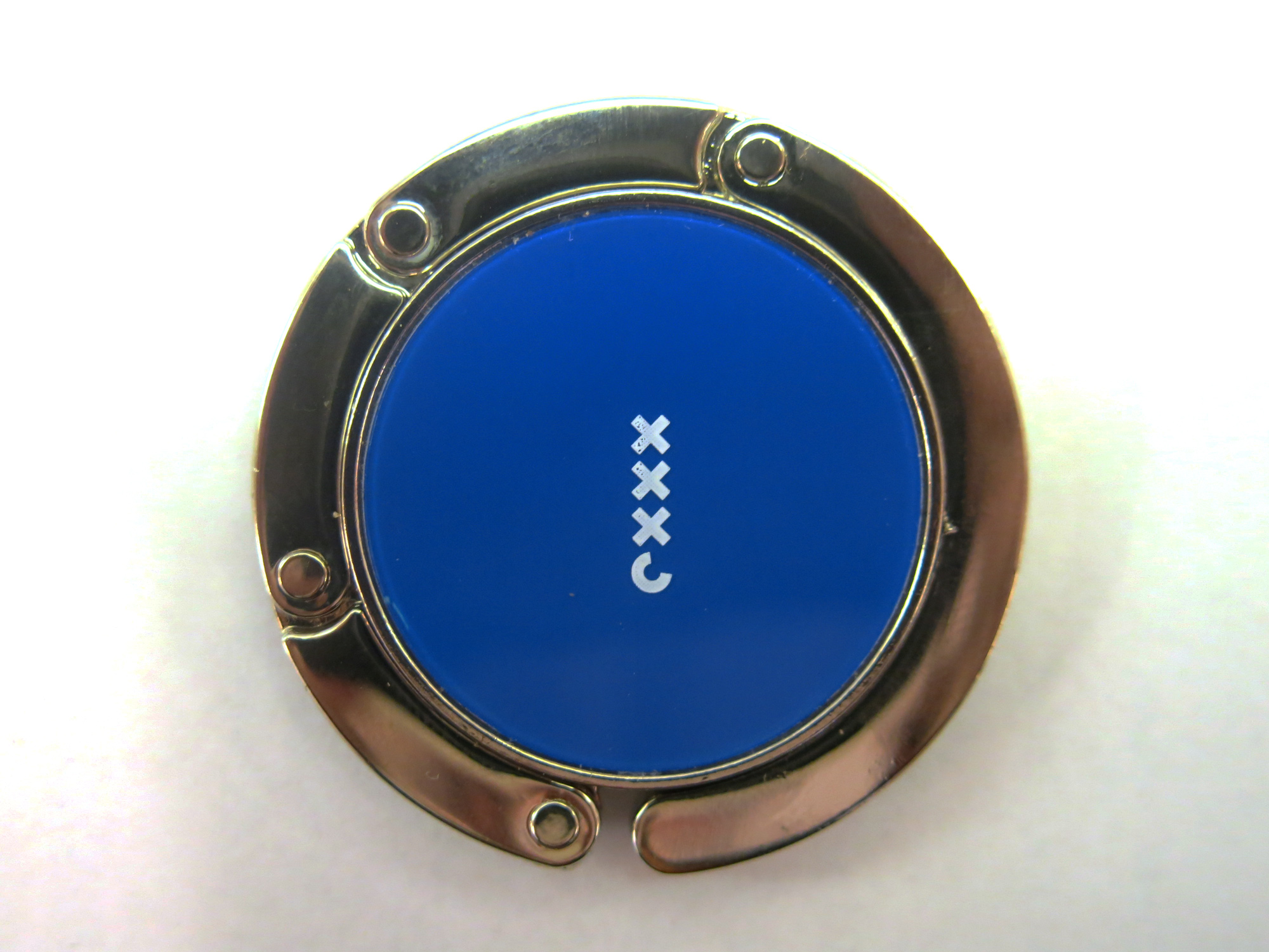 Een tassenhaak uitgegeven door het Stadsdeel Centrum van Amsterdam. Een tassenhaak is bedoeld om een (hand)tas aan een tafel of bar te kunnen hangen. Om de haak te kunnen gebruiken, moet de metalen buitenrand uitgevouwen worden – dit gedeelte vormt de haak. Het blauwe middendeel met het logo van het Stadsdeel Centrum blijft plat boven op de tafel liggen. Door het gewicht van de tas aan de haak glijdt hij niet van tafel af. Zo hoeft de tas niet op de grond te staan en heeft hij minder kans om gestolen te worden. ( Sarah Remmerts de Vries)