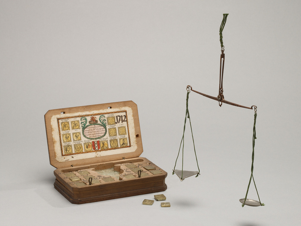In het Amsterdamse Burgerweeshuis konden kinderen van Amsterdamse poorters (burgers met rechten om in de stad te wonen) terecht, die geen ouders of een moeilijke thuissituatie hadden. Vanuit het geldkantoor werden de financiën van het weeshuis in de gaten gehouden. Het weeshuis had bijvoorbeeld veel te maken met inkomsten in de vorm schenkingen van weldoeners en uitgaven voor de dagelijkse levensmiddelen voor de wezen. Toen muntgeld nog werd geslagen van goud of zilver, waren de munten letterlijk hun gewicht in goud waard. Deze munten werden uiteraard alleen als betaalmiddel geaccepteerd als ze het juiste gewicht hadden. Sinds de zestiende eeuw waren er al muntgewichten in omloop om het gewicht vast te stellen. Deze muntgewichtdoos is vervaardigd door Abraham Groengraft (1673-1745), muntgewichtmaker en van 1718 tot zijn dood IJkmeester-Generaal van Holland en West-Friesland. Het jaar 1742 in de doos geeft waarschijnlijk aan dat de gewichten in dat jaar officieel door hem waren geijkt. ( Sarah Remmerts de Vries)