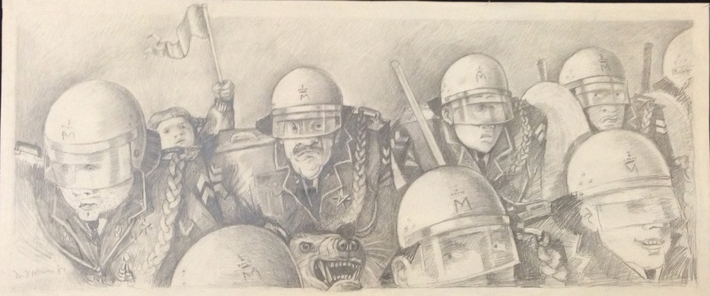 De jaren tachtig staan in Amsterdam veelvuldig in het teken van kraakacties en het optreden van de M.E. daartegen. Achter de grimmige haag van helmen houdt een klein meisje een oranje vlag omhoog. Zij herinnert ons aan de inhuldiging van koningin Beatrix op 30 april 1980. Onder de leus ‘Geen woning, geen kroning’ wordt er die dag gekraakt, gedemonstreerd en stevig gevochten met de M.E. Deze tekening is een voorstudie voor David Veldhoens schilderij met dezelfde titel. ( Laura van Hasselt)