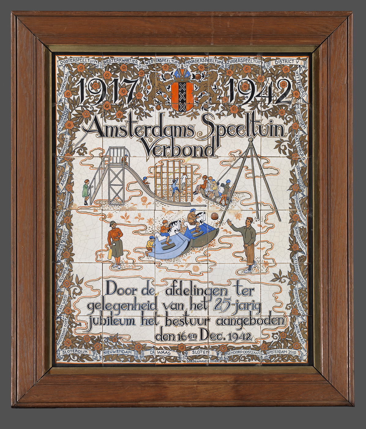 Een tegeltableau is een vlak, bestaande uit meerdere aardewerken tegels, die door een schildering één voorstelling vormen. Tegeltableaus werden vanaf de zeventiende eeuw populair, omdat ze zowel decoratief als functioneel waren. Ze boden uitkomst tegen vocht, waar huisjes langs grachten en kanalen nogal eens last van hadden, en waren gemakkelijk schoon te houden. Daarnaast zorgden de uit Italië afkomstige vormen, kleuren en motieven voor een vrolijke aanblik rond de haard of in de gang. In de periode van de Jugendstil (ca. 1900) leefde de aandacht voor tegeltableaus opnieuw op. Families en bedrijven die het zich konden veroorloven, lieten wanden, gevels en portieken versieren met tegeltableaus in Art Nouveau stijl. Ook voor jubilea en andere feestelijke gelegenheden werden soms tegeltableaus vervaardigd. Dit tegeltableau is in opdracht van de afdelingen van het Amsterdams Speeltuin Verbond door tegelbakker Koninklijke Goedewaagen vervaardigd, ter gelegenheid van het 25-jarig jubileum in 1942. ( Sarah Remmerts de Vries)