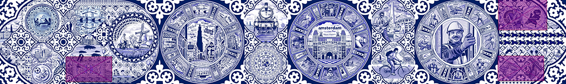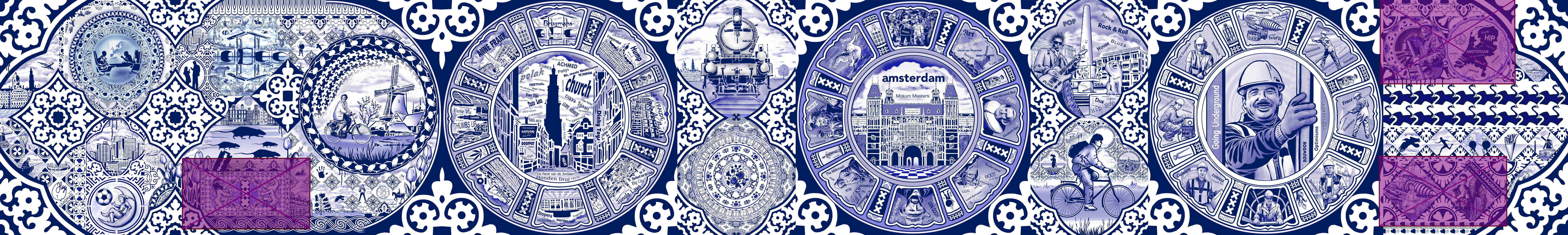 Deze drie delen vormen onderdeel van een groot bedrukt zeildoek met Delfts blauw-motief, van kunstenaar Hugo Kaagman. Kaagman maakte het doek in opdracht van Dienst Metro van de gemeente Amsterdam. Tijdens de aanleg van de Noord/Zuidlijn hing het 40 meter lange kunstwerk op het Damrak, om de schuttingen die de bouwwerkzaamheden afschermden een vrolijker aanzien te geven. De voorstelling vormt een mozaïek van deelvoorstellingen en levert een artistiek commentaar op het reilen en zeilen van de stad in de laatste tien jaar. Zo is bijvoorbeeld het Rijksmuseum prominent afgebeeld, evenals de werkzaamheden aan de Noord/Zuidlijn. Het Amsterdam Museum heeft drie kleinere delen van het doek in de collectie opgenomen. ( Sarah Remmerts de Vries)