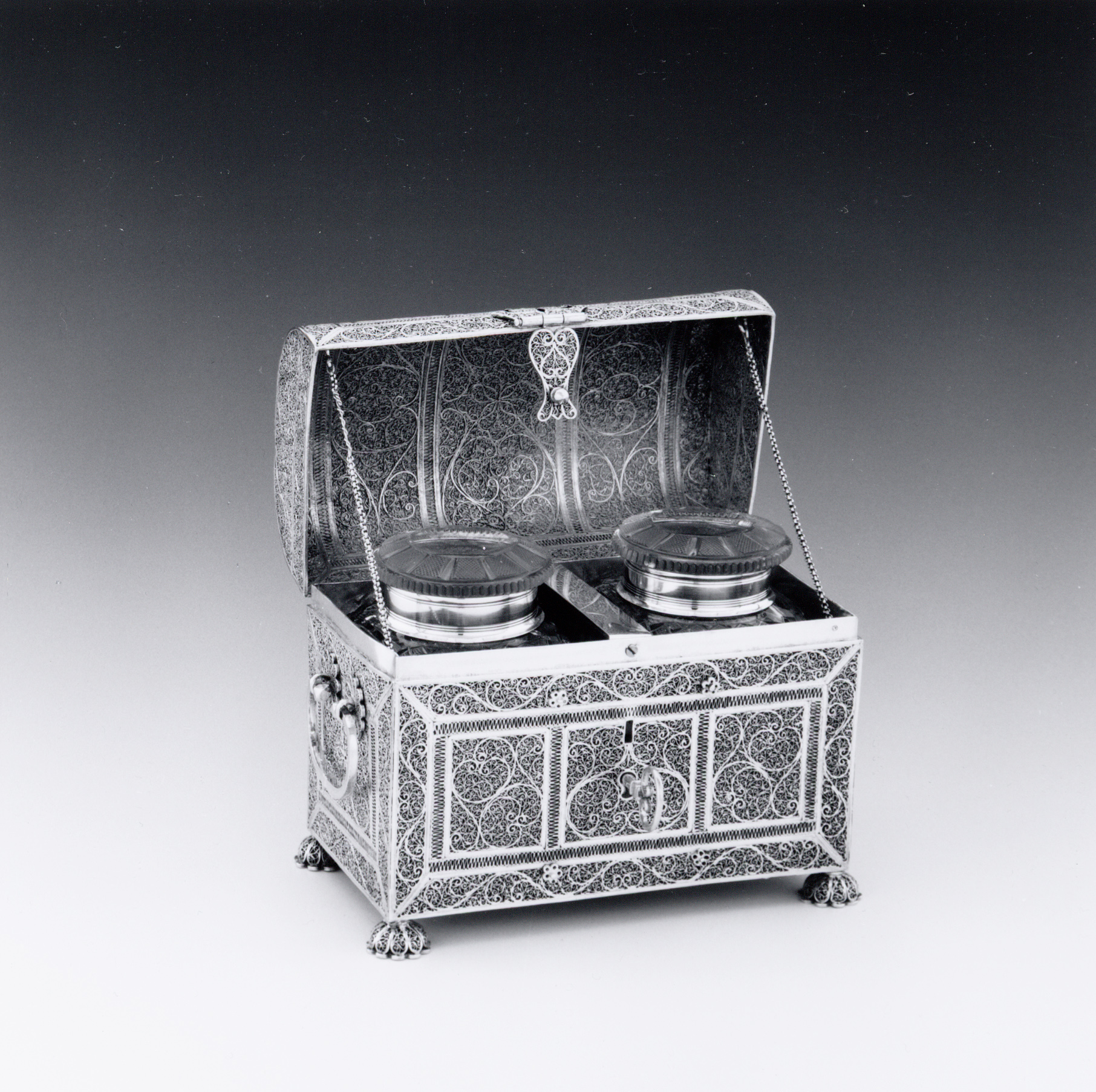 Rechthoekige koffervormige kist van filigrain zilver met vier gelobde pootjes, scharnierend deksel, slot en sleutel. Wanden kist en deksel opgebouwd uit glad raamwerk waartussen symmetrische patronen van bloemmotieven en krulwerk. Korte zijden met C-vormig oor. In de kist zitten twee rechthoekige kristallen flessen met ruitslijpsel en ronde stop met concaaf afgeplatte bovenzijde, elk met glad zilveren montuur met filetranden rondom hals.