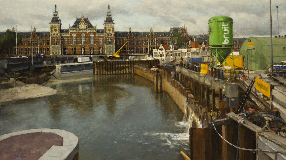 Kunstschilder Frans Koppelaar wijdt zich vanaf het begin van de jaren ’70 aan het vastleggen van Amsterdamse stadsgezichten, in een stijl die het midden houdt tussen realisme en impressionisme. Op dit schilderij is het Centraal Station te zien vanaf de Prins Hendrikkade, ter hoogte van de ingang van de Nieuwe Brugsteeg. In het water van het Open Havenfront is op palen een betonnen bruggenhoofd aangelegd. Op het moment van schilderen ligt dit eiland vol met containers en bouwmaterialen. In augustus 2015 wordt het inmiddels braakliggende bruggenhoofd gesloopt. ( Sarah Remmerts de Vries)