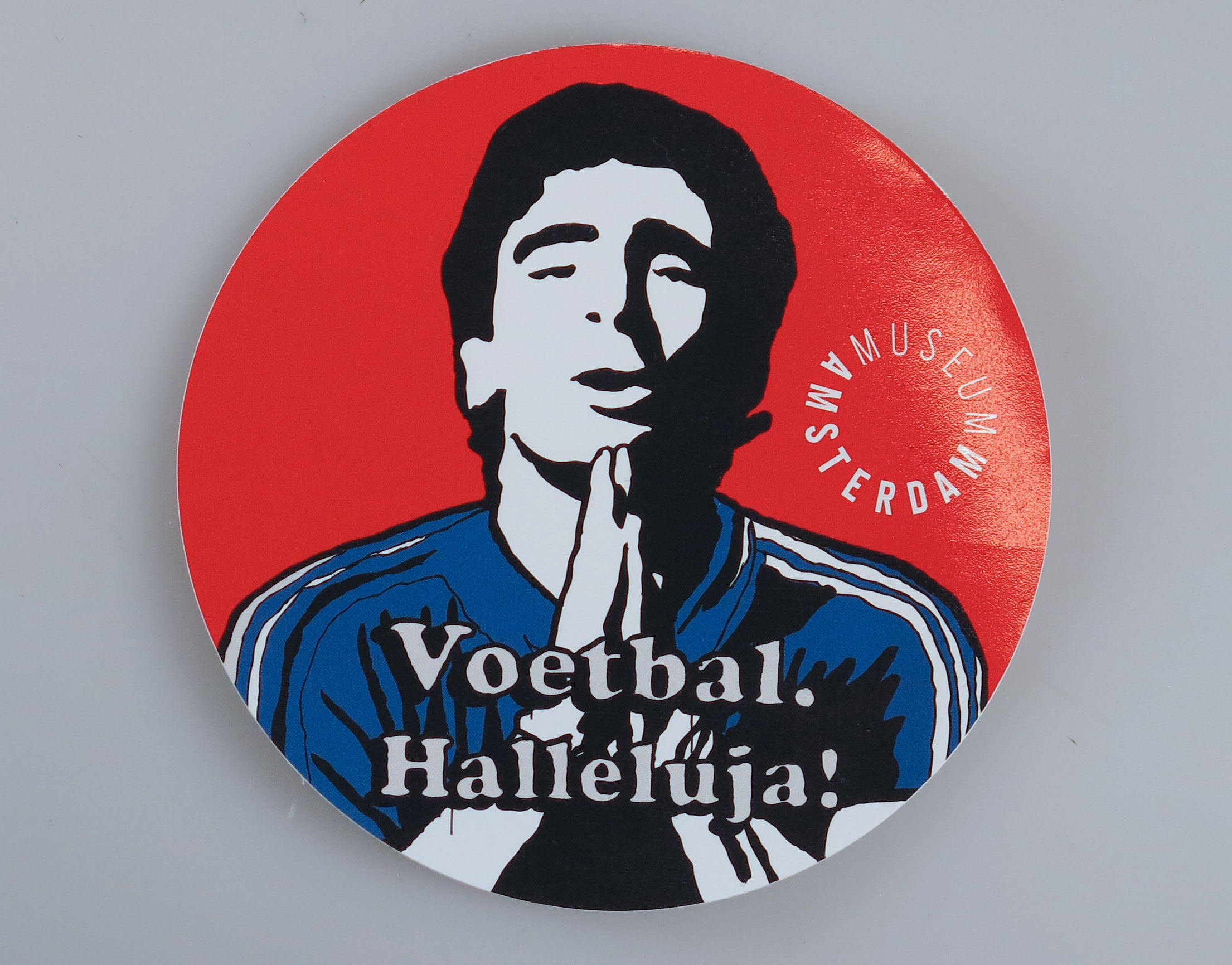 De tentoonstelling Voetbal Halleluja! was van 12 september 2014 tot en met 4 januari 2015 te zien in het Amsterdam Museum. Kamp Seedorf, een street art collectief uit Almere, ontwierp het logo van de tentoonstelling: een biddende Maradona tegen een achtergrond in Amsterdam Museum rood. Dit logo verscheen op al het promotiemateriaal van de tentoonstelling, waaronder linnen tasjes, T-shirts, gebedskaarsen en stickers. ( Sarah Remmerts de Vries)
