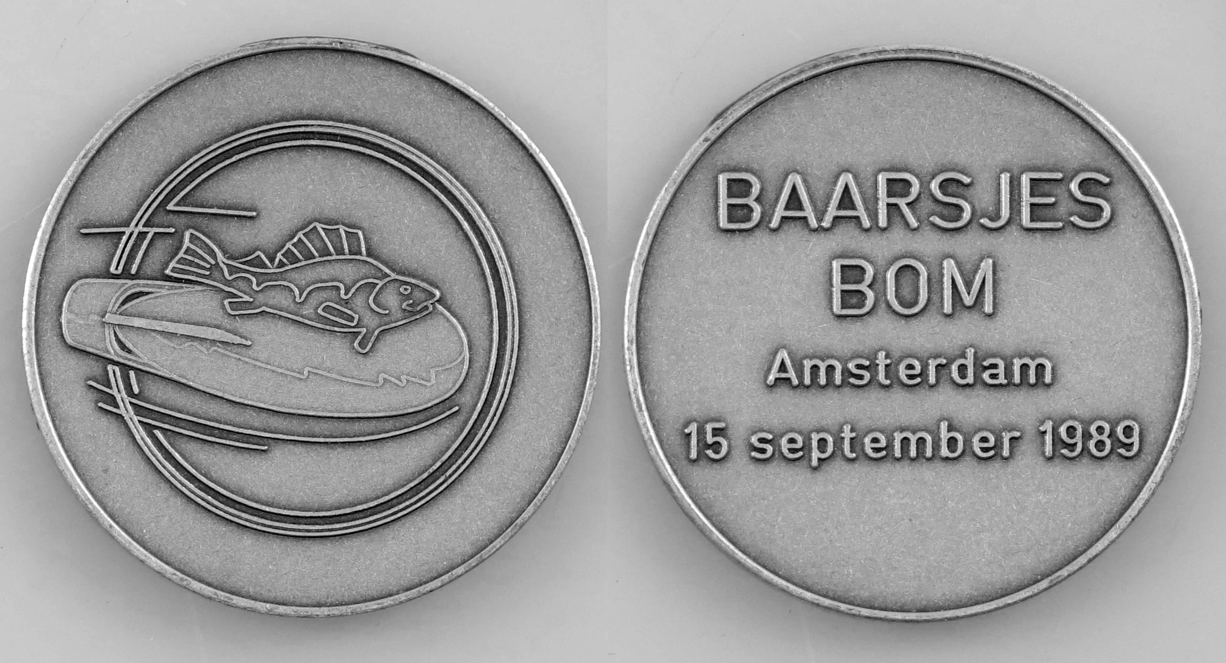 Op 15 september 1989 ruimden manschappen van de Explosieven Opruimingsdienst een bom, die al ruim veertig jaar in een achtertuin van een huis aan de Amsterdamse Baarsjesweg lag. De kans op ontploffing was al die tijd klein, omdat de ontsteking van de bom was afgebroken. De zogenaamde ‘Baarsjesbom’ is uiteindelijk in het Westelijke Havengebied tot ontploffing gebracht, met een lichtelijk tegenvallende knal. Ter gelegenheid van de opruiming werd door Medaillehuis Suurd b.v. hetzelfde jaar een penning uitgebracht. De ene zijde van de penning toont een baars, symbool voor de wijk de Baarsjes, op een vliegende bom. Op de andere zijde is de tekst ‘BAARSJES BOM - Amsterdam 15 september 1989’ te lezen. ( Sarah Remmerts de Vries)