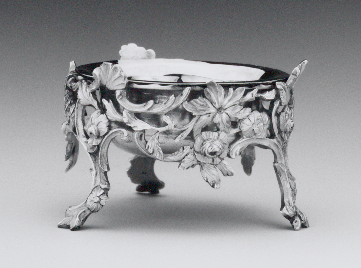 Dit model zoutvat komt in vele varianten voor en is door verschillende zilversmeden vervaardigd. Kenmerkend voor het type is de gegoten houder, gevormd uit sierlijk gebogen twijgjes die uitlopen in drie pootjes. De naturalistische bloem- en bladranken van dit vaatje zijn zeer fijn nabewerkt.
