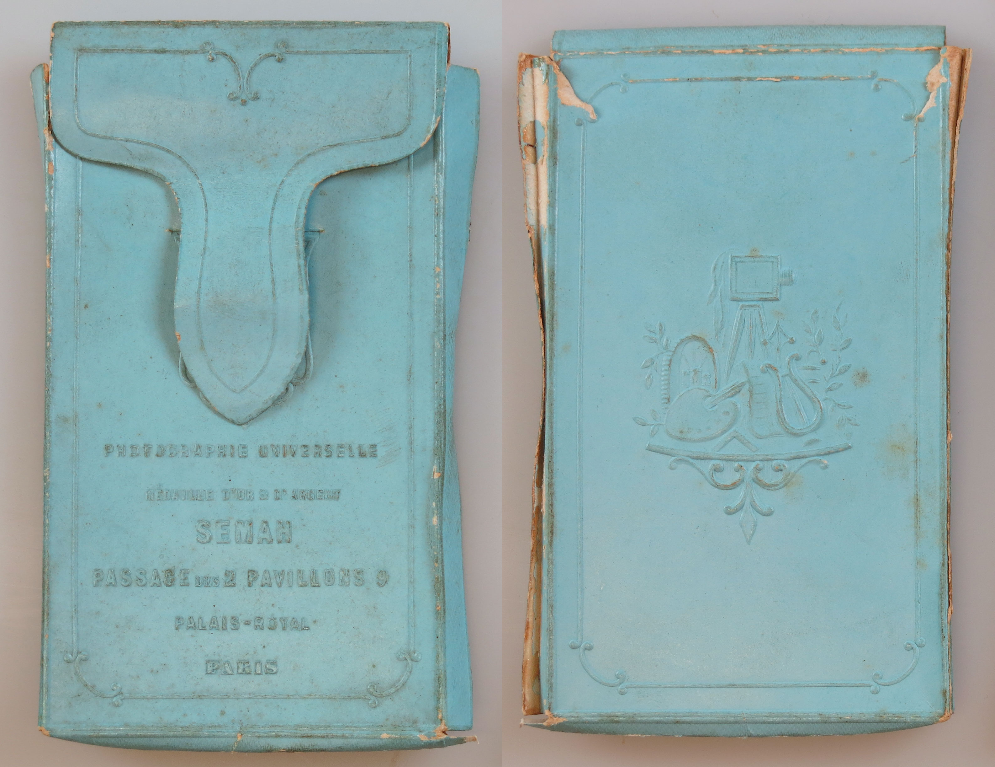 Lichtblauw doosje met opdruk: PHOTOGRAPHIE UNIVERSELLE/ MÉDAILLE D'OR & D'ARGENT/ SEMAH/ PASSAGE DES 2 PAVILLONS 9/ PALAIS-ROYAL/ PARIS.- Trefwoorden