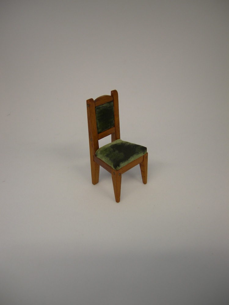 Houten stoel met een donkergroen velour zitting en middendeel van de rugleuning. Velour is sleets in het midden van de zitting en leuning. Identiek aan KA 19764.13, KA 19764.14 en KA 19764.26