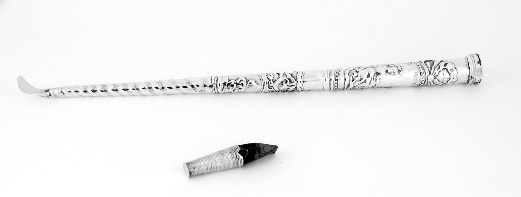 Rug- of hoofdkrabber (onder de pruik) lange conische steel in een gestamd decor van een medaillon met lint en strik waarin een afbeelding van een vrouw met een vrijheidsstaf? en een klimmende leeuw en tekst met ”voor Vaderlandt in VRIJH” waaronder nog een medaillon met mogelijk een godin, Justitia en het onderste deel getorst eindigend in een klein lepelvormig krabbertje. De bovenzijde heeft een vlak deksel gesoldeerd met tin en was waarschijnlijk voorzien van een ingedraaid oog. In de binnenzijde zit een staafje lood ter verzwaring. (rammelt, zit los)