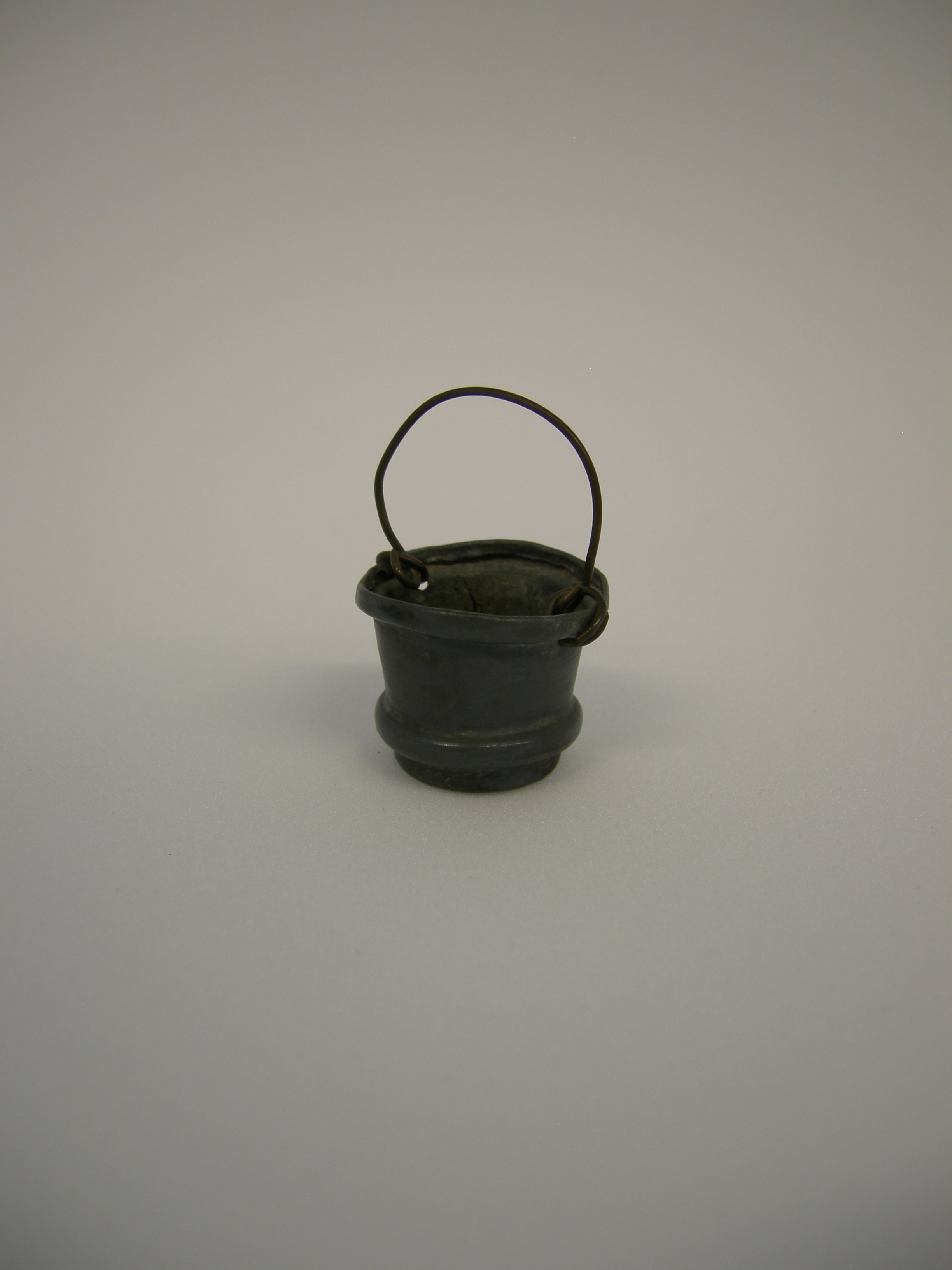Kleine grijs metalen emmer met een hengsel van koperdraad. Er is een verdikking (rand) in het metaal van het emmertje in horizontale richting bij de voet en net onder de rand.