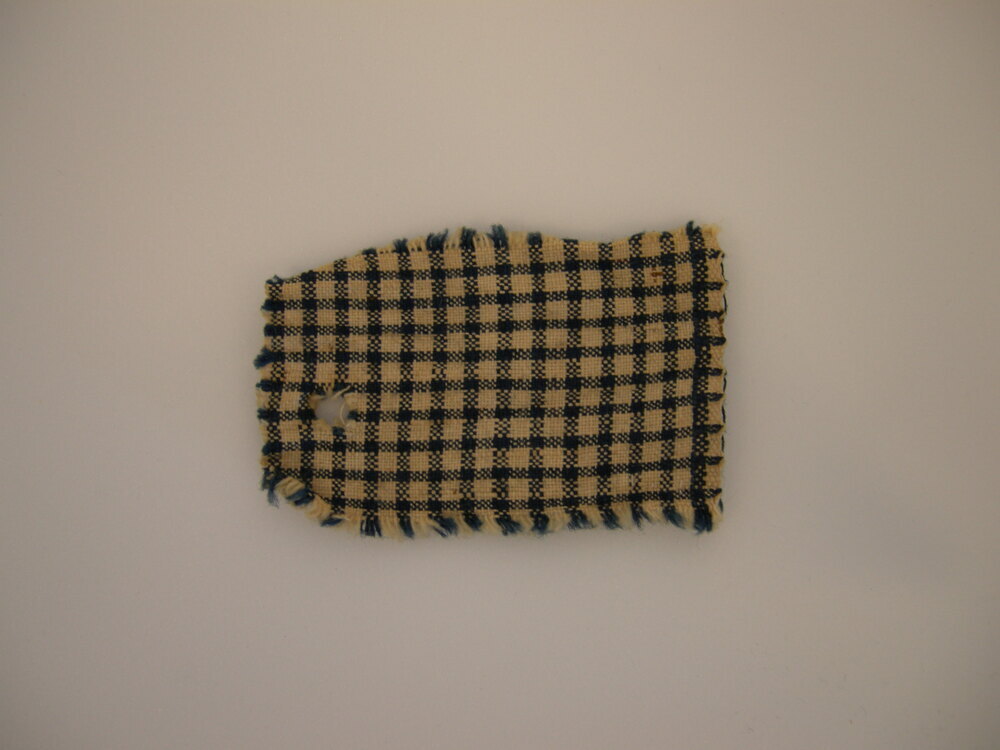 Geruit doekje met een gaatje. Kleur: blauw / wit. Waarschijlijk een keukendoek, het gaatje dient om de doek aan een spijkertje bij het keukentje op te hangen.