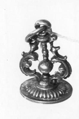 Handvat gedreven, dubbel voluut op ribbelrozet, wapen met zeven-puntige kroon, halve adelaar en drie klavers- Trefwoorden