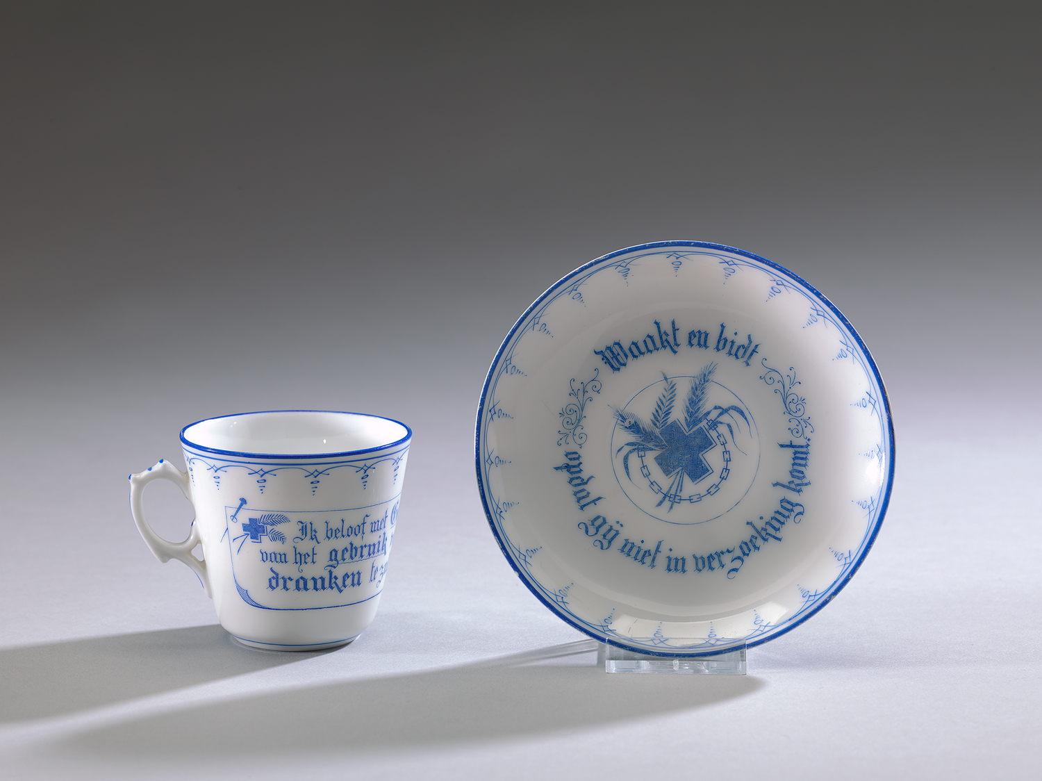 'Ik beloof met God's bijstand mij voor altijd van het gebruik van bedwelmende dranken te zullen onthouden.' Dat is de gelofte die het theekopje siert van een bijzondere kop-en-schotel die recent aan het Amsterdam Museum werd geschonken. Wanneer de theedrinker het kopje aan de lippen zette, werd hij met nog een tekst geconfronteerd, op het schoteltje: een oproep tot waakzaamheid en gebed om niet in de greep van de drankduivel te vallen. Daarnaast is er op kop én schotel een blauw kruis afgebeeld, het symbool van de Nationale Christen Geheel-Onthouders Vereeniging (NCGOV), ook wel Nederlandse Vereniging Het Blauwe Kruis genoemd. Het museum ontving verder een steekspeld van Het Blauwe Kruis als aanvulling op de collectie.
