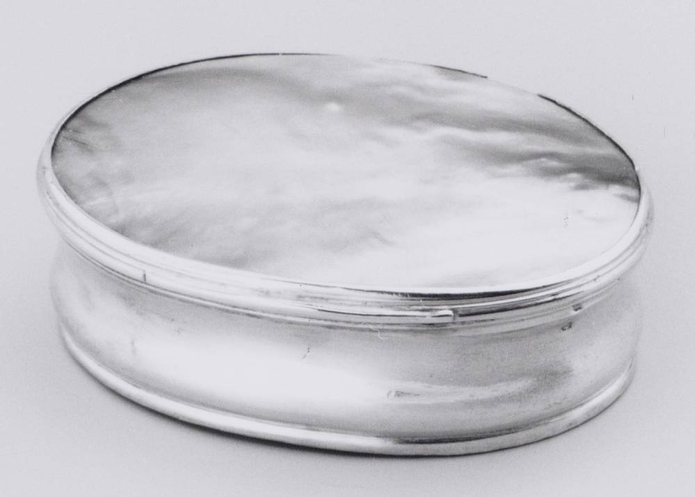 Parelmoer werd in de achttiende eeuw dikwijls voor deksels en bodems van zilveren dozen gebruikt. Men paste het materiaal, afkomstig van schelpen uit tropische wateren, toe in de vorm van zowel gladde, onversierde platen met gesneden reliëfvoorstellingen. In 1741 vervaardigde Louis Métayer een grote zilveren doos waarin hij twee, aan Cornelis Bellekin (werkz. ca. 1650-ca. 1700) toegeschreven parelmoeren plaques verwerkte (cat.nr. KA 14668). Zie voor twee snuifdozen met bijzondere parelmoeren deksels: Wttewaall 1994~2, p. 271 afb. 840, 842). Zie het commentaar bij cat.nr. KA 3805. ( Bert Vreeken)