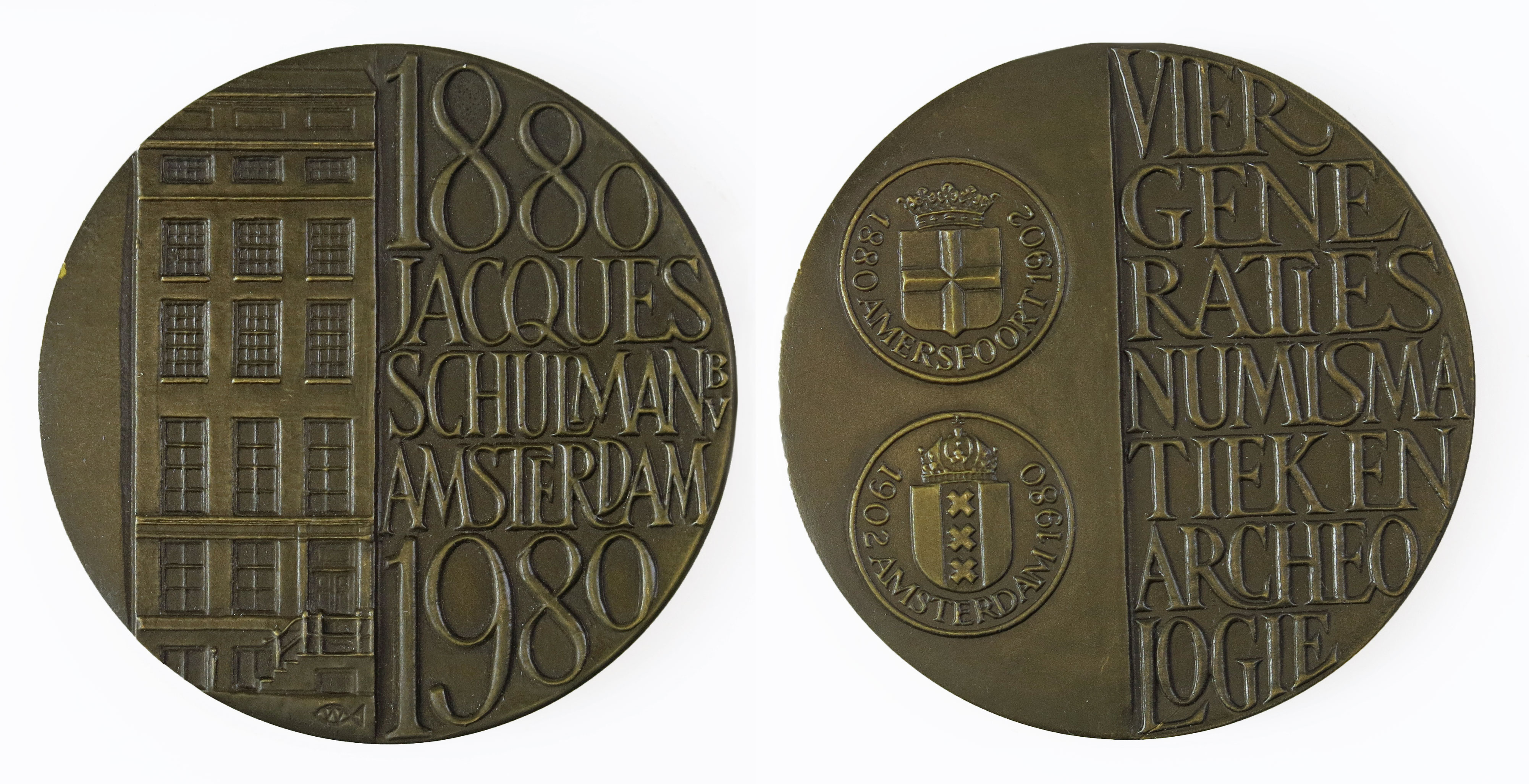 Deze bronzen penning is uitgebracht ter gelegenheid van het honderdjarig bestaan van Jacques Schulman BV, handelshuis te Amsterdam voor munten, penningen en archeologische objecten. De voorzijde van de penning toont een aanzicht van het kantoor aan de Keizersgracht, met ernaast de jaartallen van het jubileum en de naam van het handelshuis. Op de achterzijde zijn onder elkaar de wapens van Amersfoort en Amsterdam te zien, met onder elk wapen de vestigingsperiodes van Schulman. Zo valt af te lezen dat het kantoor van 1880 tot 1902 in Amersfoort gevestigd was, alvorens het naar Amsterdam vertrok. De andere helft van de achterzijde toont de tekst: ‘Vier generaties numismatiek en archeologie’. ( Sarah Remmerts de Vries)