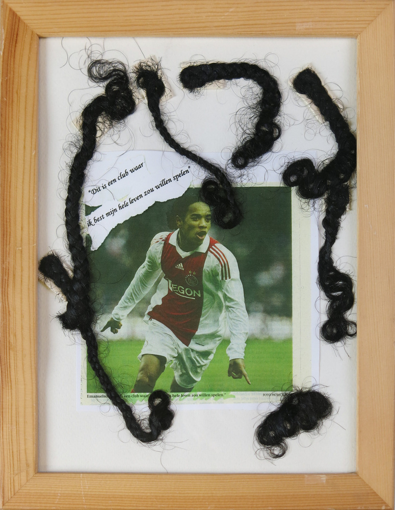 Zeven stukken gevlochten mensenhaar, ingelijst samen met een krantenfoto en een citaat ("Dit is een club waar / ik best mijn hele leven zou willen spelen.") van Urby Emanuelson.