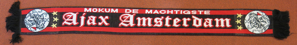 In de buurt van de ArenA worden voor en na de wedstrijden allerlei fanartikelen verkocht. Veel supporters dragen een jack, shirt of sjaal om aanhankelijkheid aan hun club uit te drukken. Op deze sjaal zijn de kleuren van Ajax (wit-rood) gecombineerd met de kleuren van Amsterdam (rood-zwart). De verbondenheid met Ajax is betekent ook verbondenheid met Amsterdam. 'Mokum de Machtigste' staat er dan op deze sjaal. Mokum is een Hebreeuws woord dat 'plaats' betekent. Het is een populaire bijnaam voor Amsterdam geworden. Op de uiteinden van de sjaal staat het oude Ajax logo. Dit logo is in de jaren ’90 van de 20ste eeuw vervangen door een nieuw, gestileerder logo, maar veel van de (fanatieke) Ajax fans houden vast aan het oude logo. De drie sterren slaan op de 30ste kampioenstitel die Ajax in 2011 behaalde. ( Annemarie de Wildt)