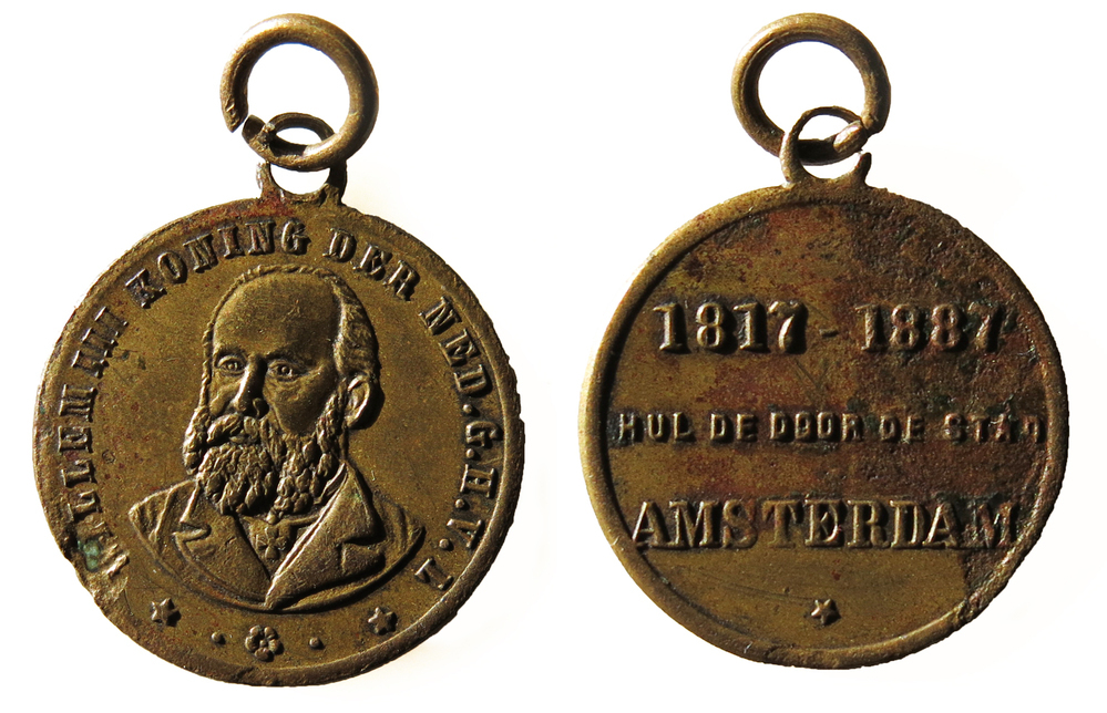 Willem III (1817-1890) was van 1849 tot zijn dood in 1890 Koning der Nederlanden en groothertog van Luxemburg. Ter gelegenheid van de aprilfeesten te Amsterdam bij de zeventigste verjaardag van Koning Willem III werd er een draagpenning uitgebracht. De aprilfeesten worden nog steeds elk jaar op de Nieuwmarkt gegeven. ( Imke Pouw)