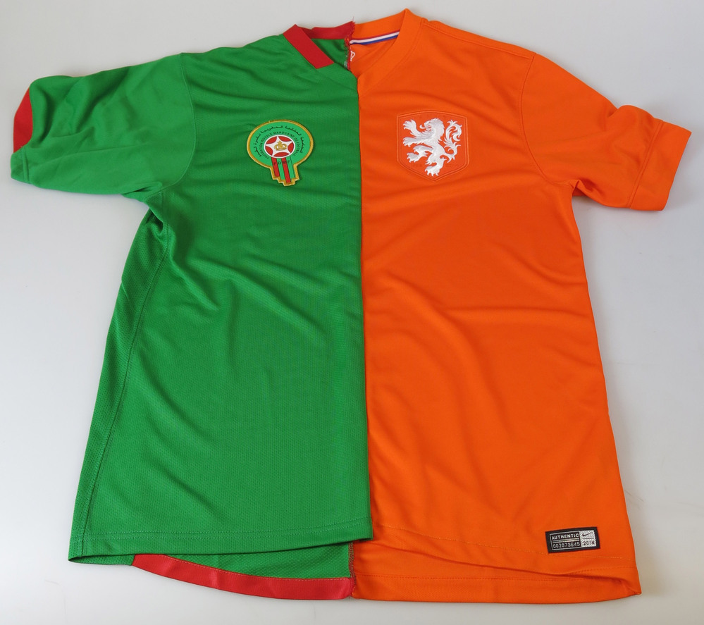 Het ontwerp van dit shirt heet in heraldische termen 'gedeeld'. De thuisshirts van Marokko en Nederland worden getoond met de emblemen van de nationale voetbalfederaties die symbool staan voor de koningshuizen. Hiermee maakt Floor de dubbele nationaliteit (paspoorten) letterlijk zichtbaar. De ontwerper maakt dit shirt wel vaker voor Amsterdammers met een dubbele nationaliteit. ( Annemarie de Wildt)