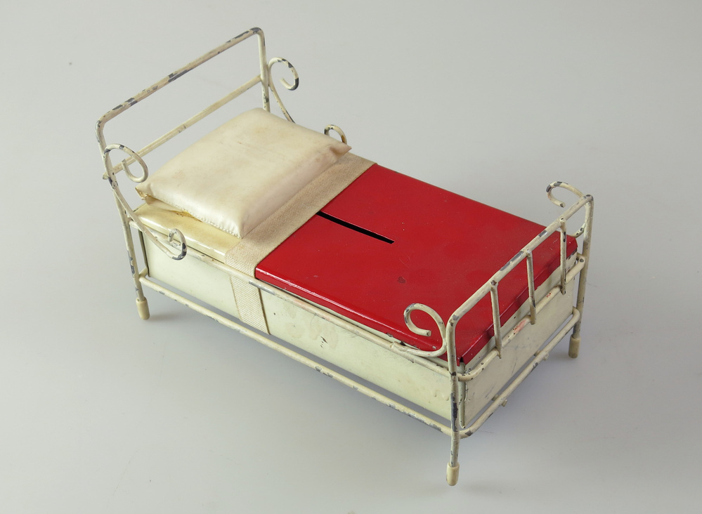 De Witte Bedjes-actie is begonnen in 1946, op initiatief van journalist Henri Knap. Knap zette via zijn dagelijkse rubriek ‘Amsterdams dagboek’ in het Parool een inzamelingsactie op touw, om kinderen in ziekenhuizen sinterklaascadeautjes te geven. Het werd een succes en Knap besloot het in de jaren erna te blijven organiseren. De actie kreeg zoveel bekendheid dat artiesten als Willy Alberti en André van Duin hun naam eraan verbonden, door op te treden tijdens ‘De nacht van de witte bedjes’ in de City Bioscoop te Amsterdam. In 1967 werd Stichting Witte Bedjes Het Parool opgericht en het doel verbreed. Naast sinterklaascadeautjes ging de stichting zich ook bezighouden met de organisatie van kleinschalige projecten voor zieke en gehandicapte kinderen. Deze bijzondere collectepot in de vorm van een ziekenhuisbed is gebruikt om geld op te halen voor de stichting. Het collecteren werd niet alleen door vrijwilligers gedaan, maar soms ook door bekende mannequins in het uitgaansleven. ( Sarah Remmerts de Vries)